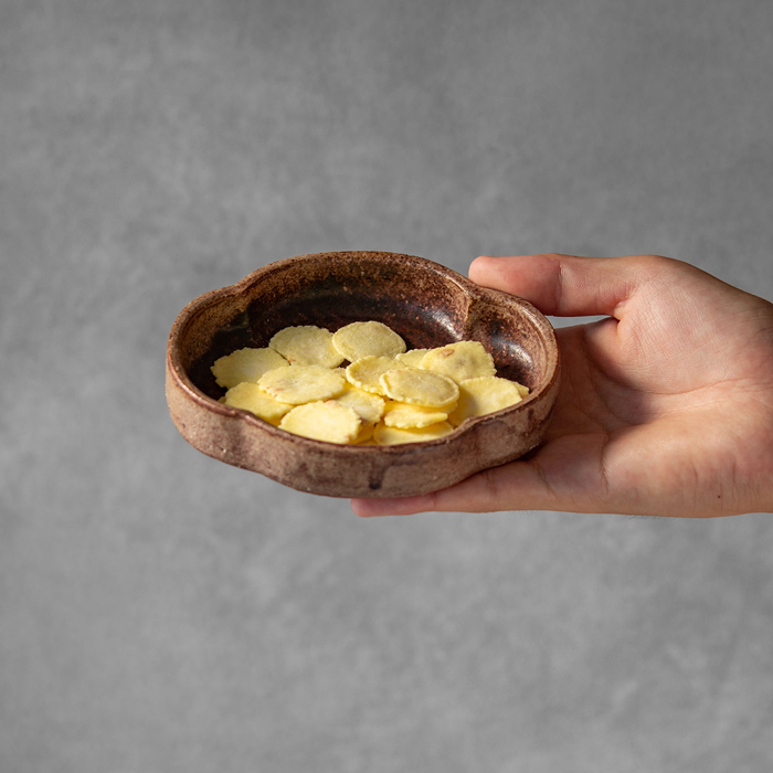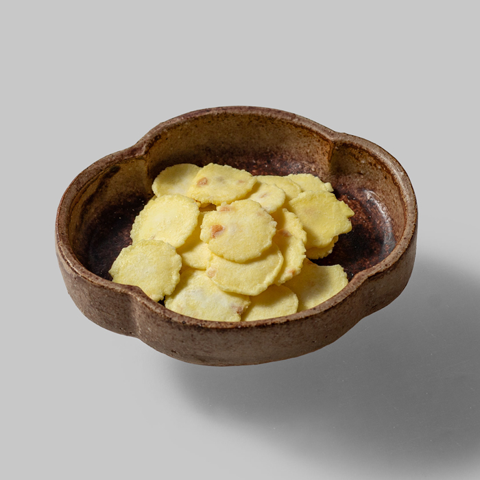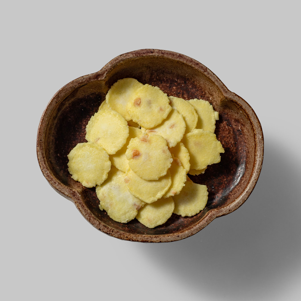 チーズと落花生を入れたせんべい生地を油で軽く揚げています。