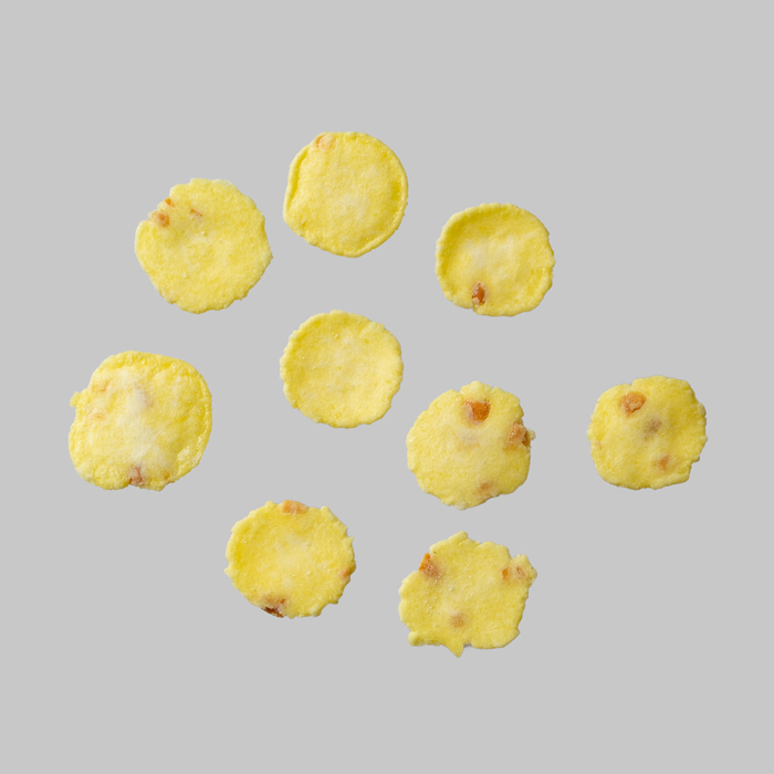 原材料名 | 馬鈴薯澱粉、食塩、ナチュラルチーズ、ピーナッツ大豆油、鶏卵/着色料(黄4、赤102)アミノ酸等(リン酸カルシウム、グルタミン酸ナトリウム) |