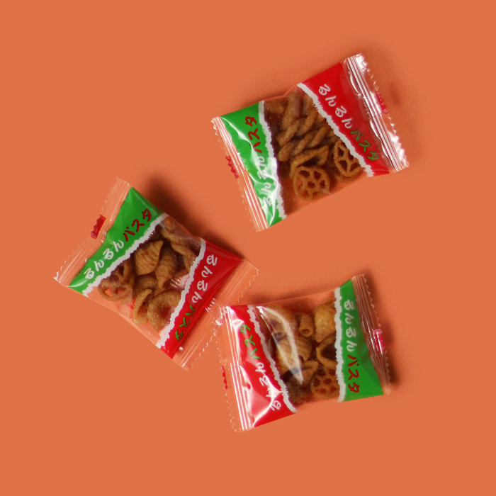 ツイスト・トリベリ・シェル・ホイールの小さくかわいい4種類のパスタスナックが個包装されています。